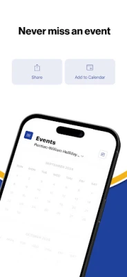 NEVER MISS AN EVENT The event section shows a list of events throughout the district. Users can add an event to your calendar to share the event with friends and family with one tap.